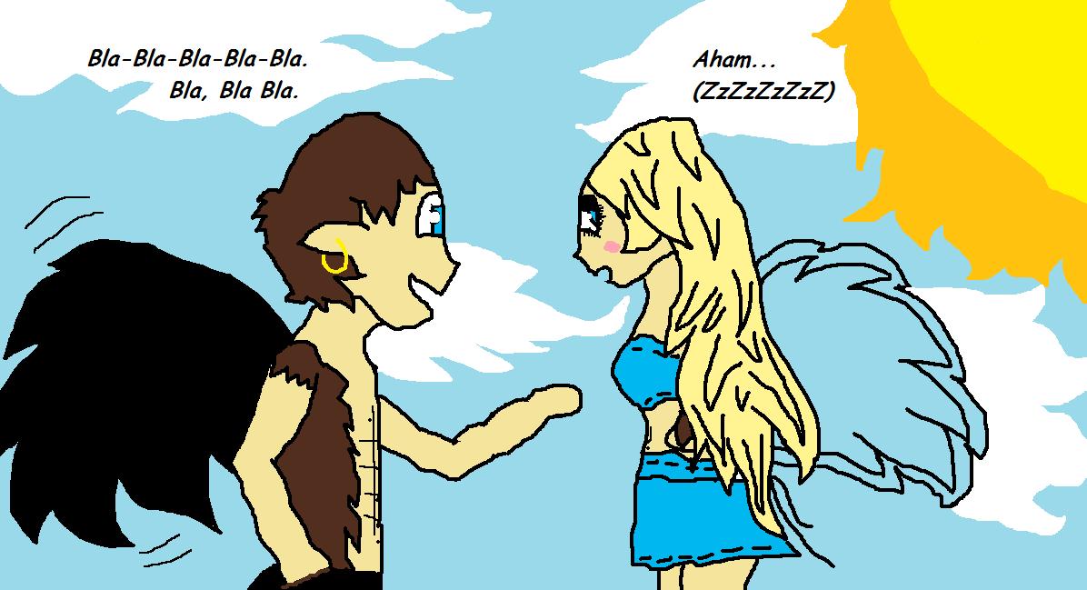-¡Uy! ¡Perdón! ¡Perdón! ¡Lo siento! ¡De verdad!- Dije preocupada, pero al instante se me paso la preocupación ya que me dí cuenta de unas cuantas variaciones... Primero: ¿DÓNDE ESTABA? Segundo: ¿CÓMO NARICES HABÍA LLEGADO ALLÍ? Tercero: ¿POR QUÉ ESTE CHICO TIENE ALAS? Cuarto: ¿DONDE ESTABA EVA? y por último quinto: ¿QUE LLEVO PUESTO? Claro que lleve las manos a la espalda instintivamente y apareció un sexto: ¿LLEVO ALAS?