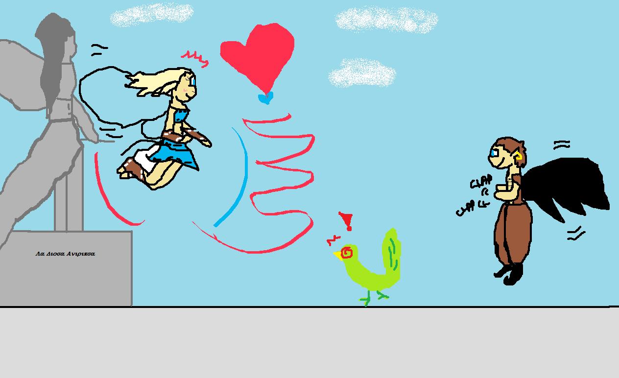 Entonces toque aquella estatua, y algo extraño me envolvió.. era como… una extraña y tranquilizante brisa, entonces me di cuenta de que Eva también lo estaba tocando… Y de que estábamos flotando en el aire, cada vez mas alto, mire a la anciana, ella sonreía, yo no tanto… Note que Eva me agarraba la mano, pero por mucho que apretábamos, algo nos iba separando.
