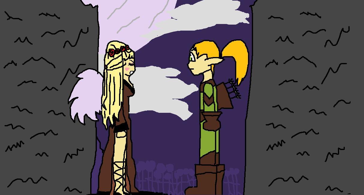 Y entonces me acordé de que tenía una amiga que encontrar. Aproveche para irme pitando. Encontré, por el camino unas cuantas estatuas: Una arquera, un guerrero y una especie de casa abandonada. También encontré unos mercadillos y talleres, y mucha gente extraña. Me topé con una estatua de un hada . Junto a ella, había una hada parecida a mi amiga alado de otro hada-demonio a juzgar por las alas que tenia...Un segundo... ¿Alas?¿Esqueletos?¿Demonios?¿Hadas? Estaba claro que estaba perdiendo el juicio. Me tire por el suelo y empecé a chillar: