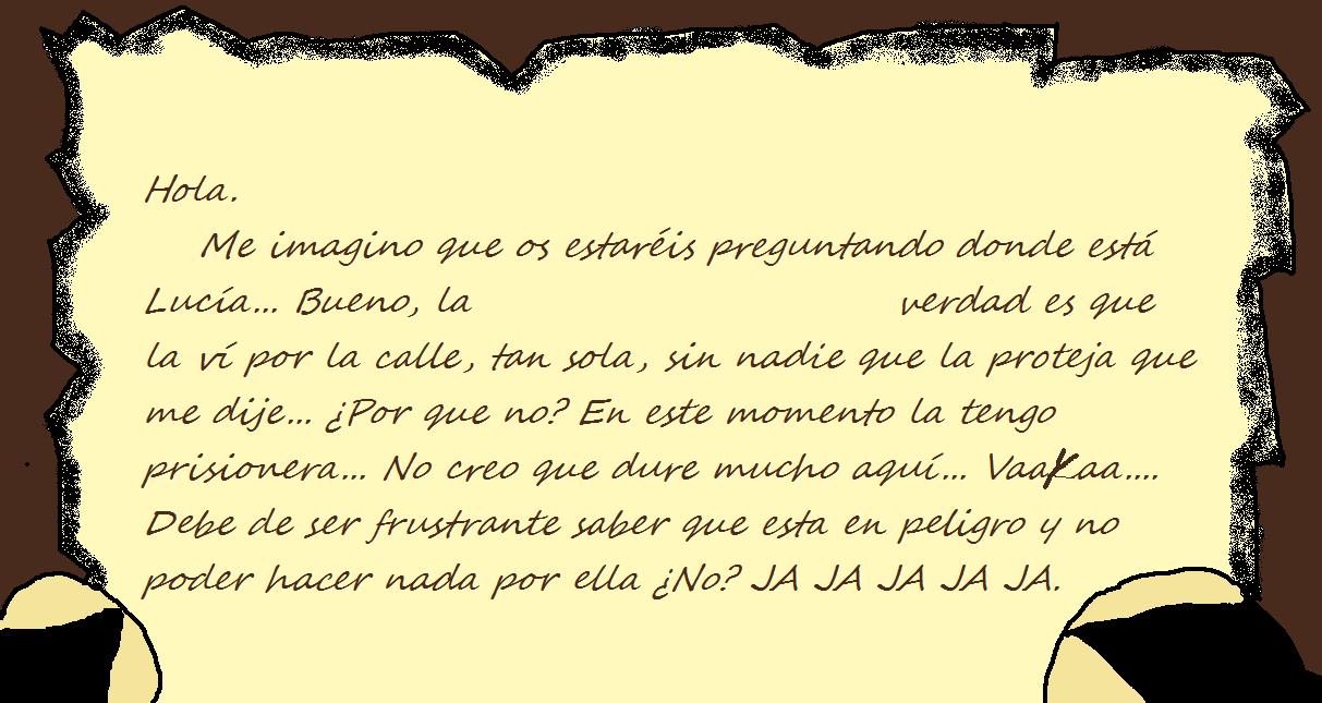 -Largate, o te juro que antes de morir te torturare de la forma que sea.-Entonces, Carlota le agarro por las mejillas y las acerco a los labios haciendo que Cris pareciera un pez o algo asi y le planto un morreo aun sujetando los labios. Despues, le aparto la cara bruscamente. Eva estaba que echaba humo pero Cris la hizo ademan de que se calmara o la matarian a ella primero. A ella se la escapo una lagrima, pero asintio. Entonces pasaron muchas cosas a la vez. En la puerta del fondo, vi la sombra de un Yopuka apoyado en su espada. Estaba sonriendo.